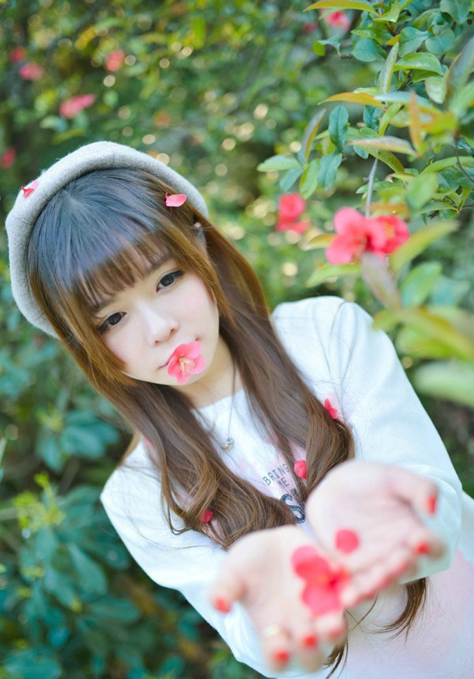 桃花树下吃花少女