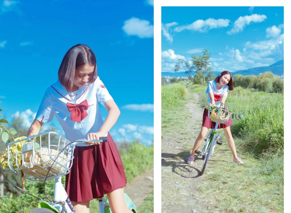 明媚天空下的单车校服妹子阳光活力