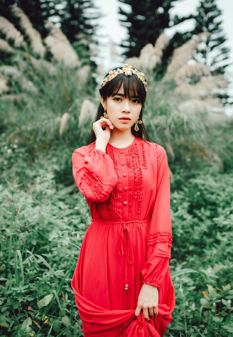 绿野处的红裙艳丽美女文静温婉