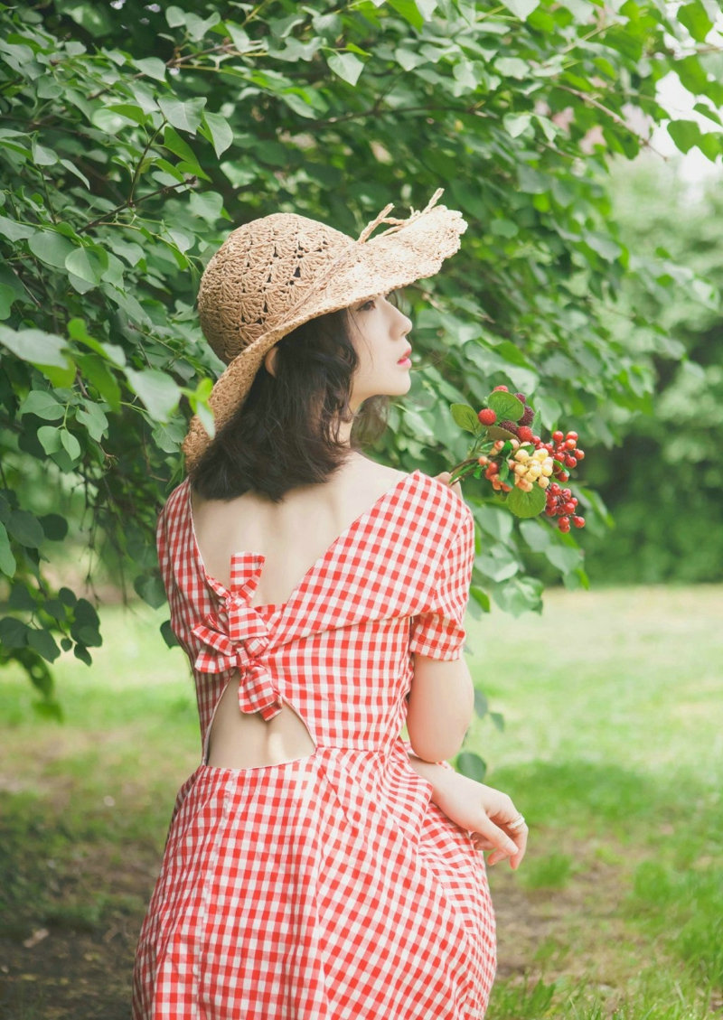 草帽清纯美女红白格子连衣裙户外靓丽写真