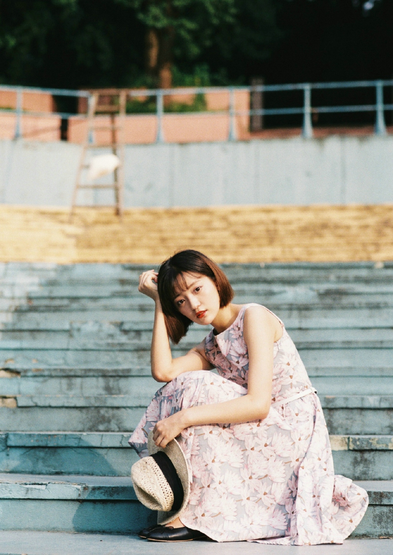 草帽清纯美女红白格子连衣裙户外靓丽写真