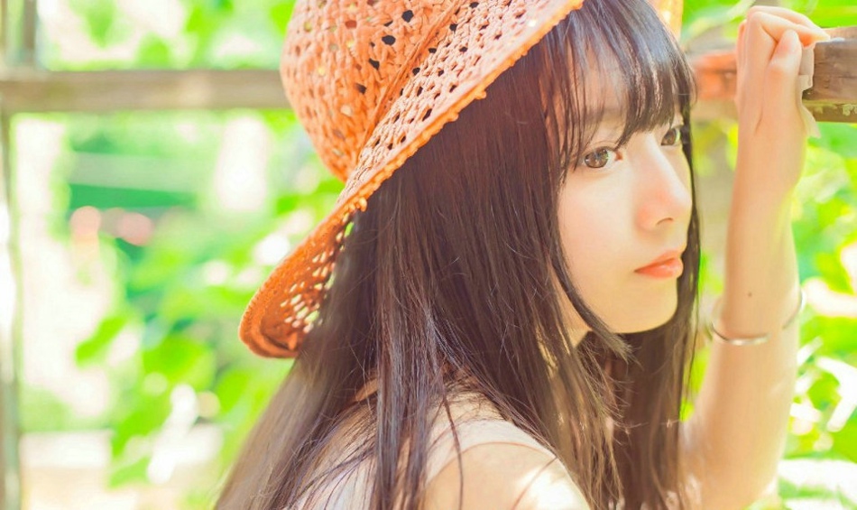 草帽清纯美女红白格子连衣裙户外靓丽写真