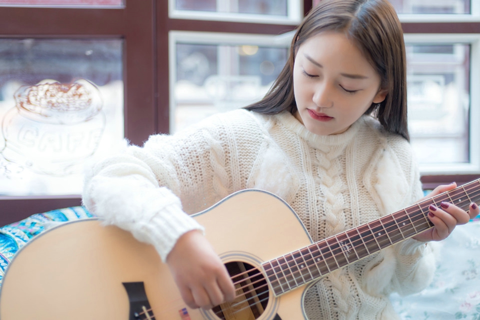 初冬咖啡店内的吉他美女懒散自在蜜糖笑容动人